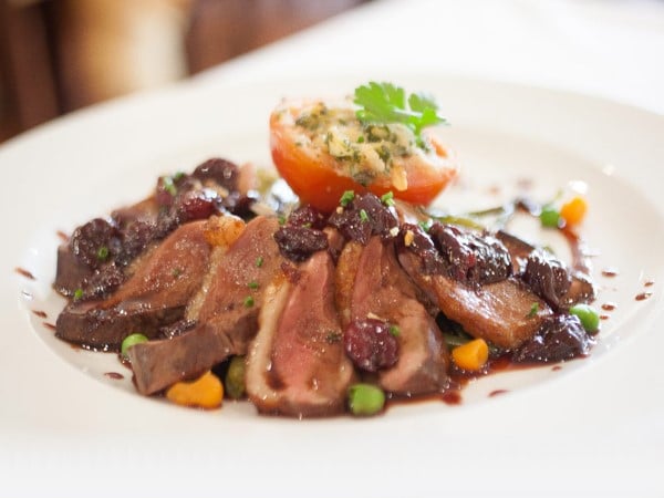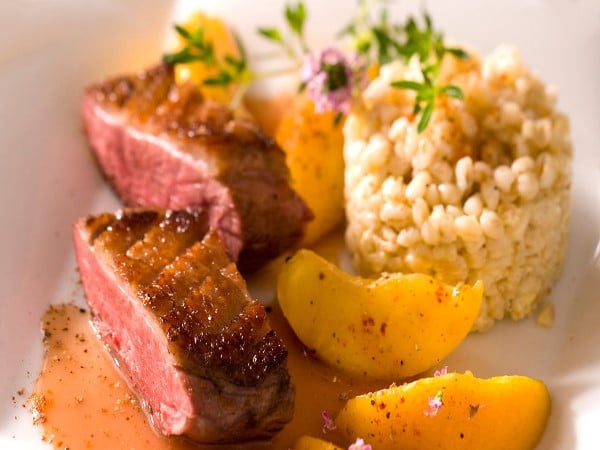 Magret de canard épicé aux pêches, risotto d’orge perlée