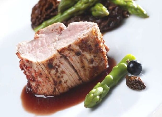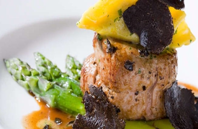Filet mignon de porc aux lames de truffes et asperges vertes