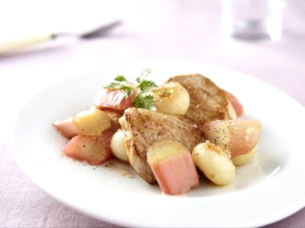 Filet mignon de porc à la rhubarbe et aux oignons nouveaux