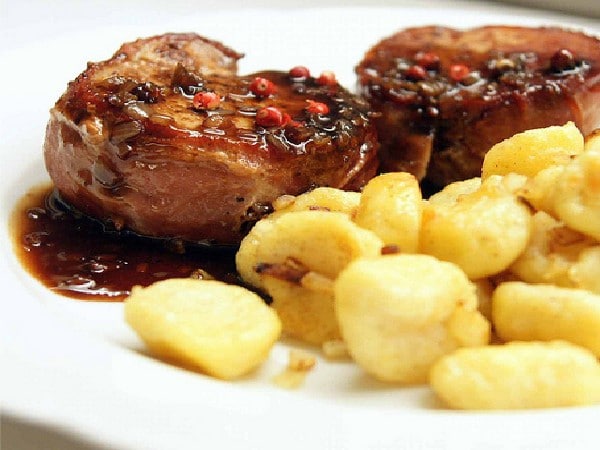 Filets de porc en sauce au poivre de Malaga, gnocchis au parmesan