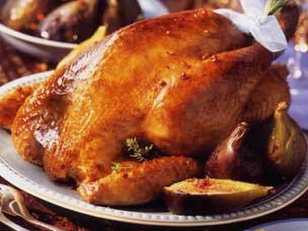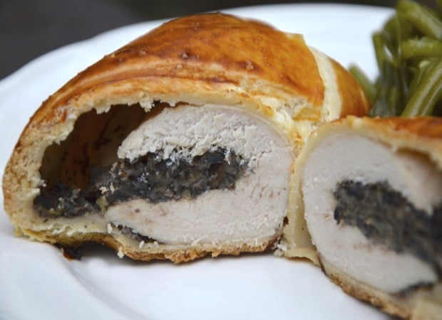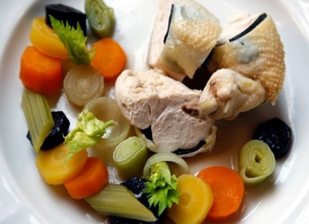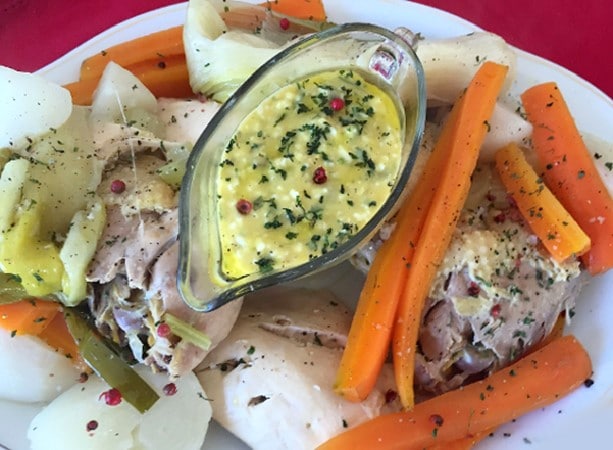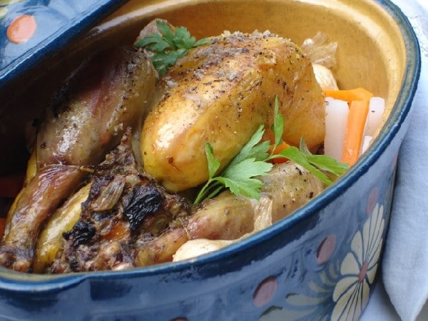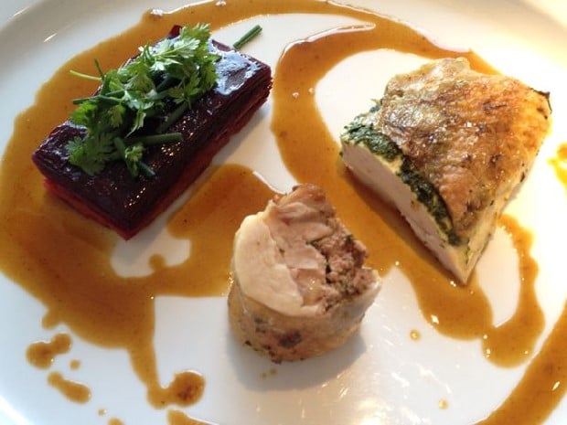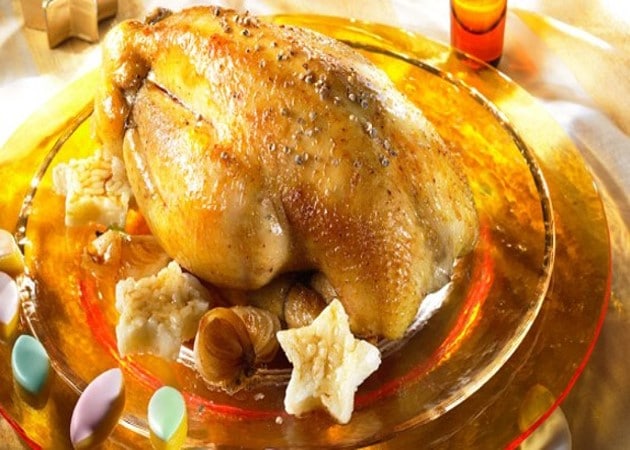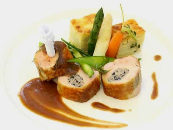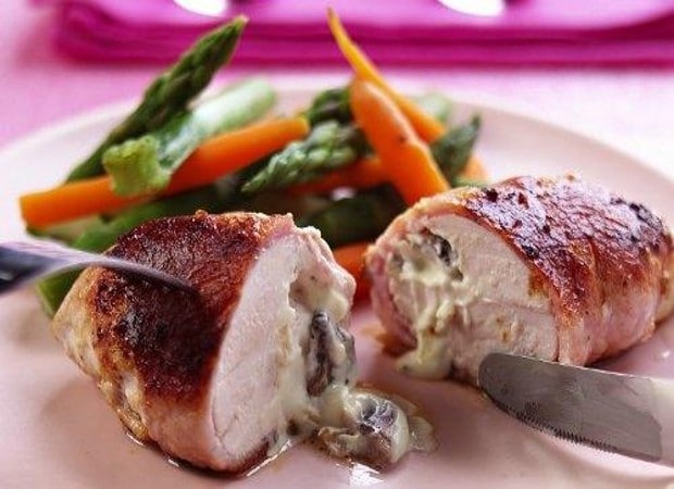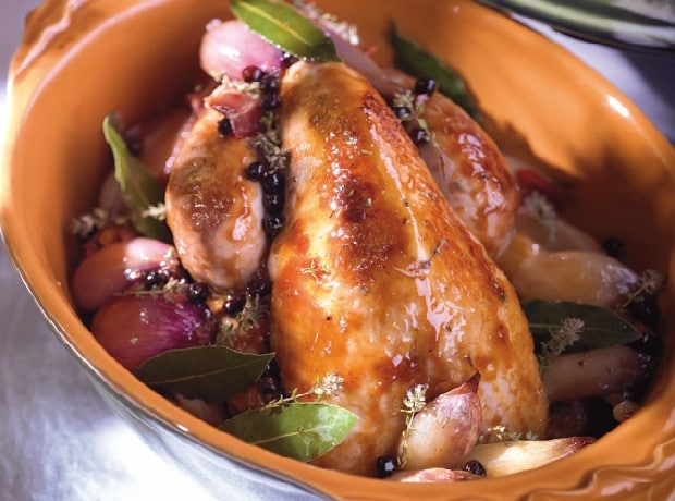 Pintade farcie aux champignons, accompagnée de jeunes légumes fondants