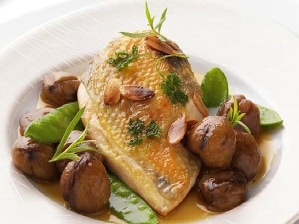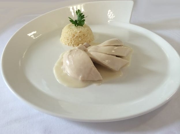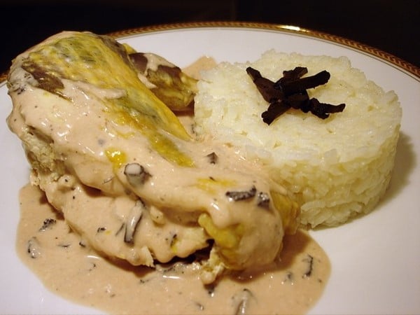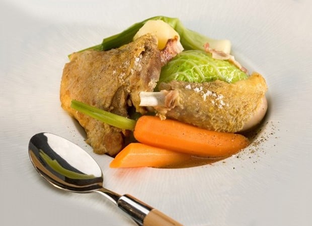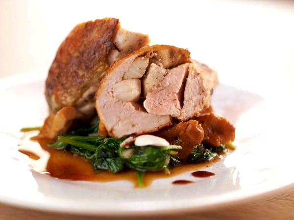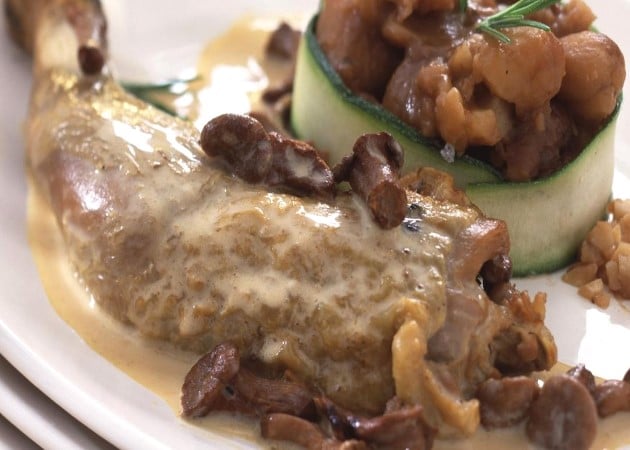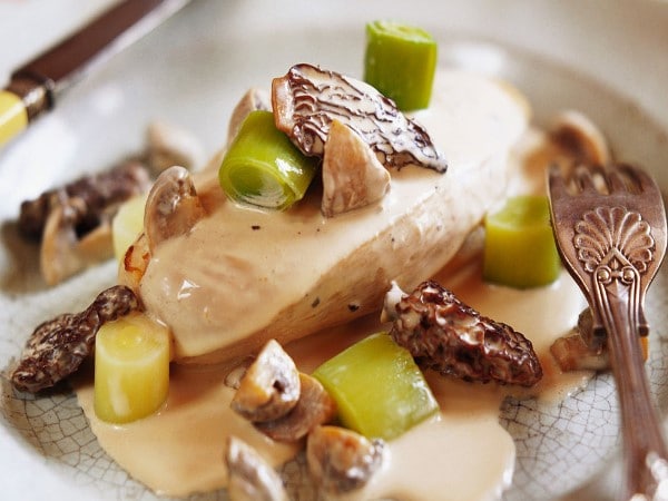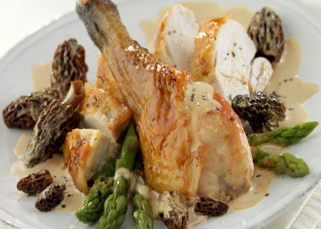 Cuisse de chapon au vin jaune, aux morilles et asperges vertes