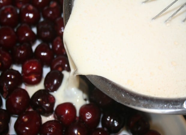 Remplissage de la pâte à clafoutis sur les cerises