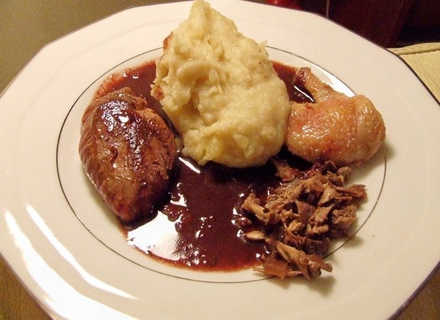 Pigeon en 3 cuissons, écrasée de pomme de terre et sauce au vin et chocolat