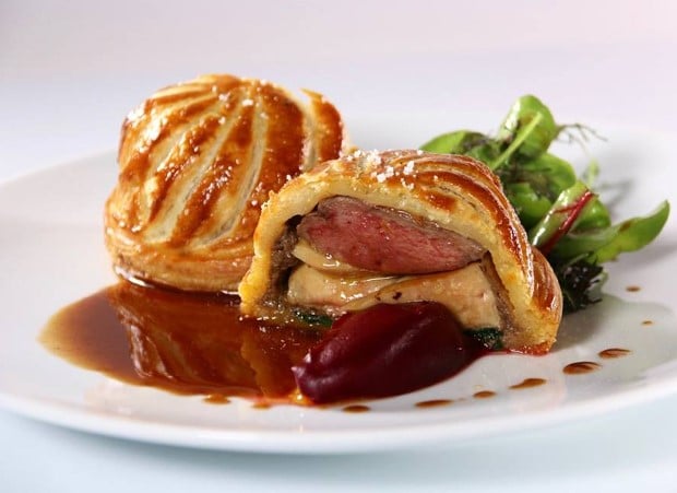 Tourte d’aiguillette de pigeon au foie gras et aux pousses d’épinards
