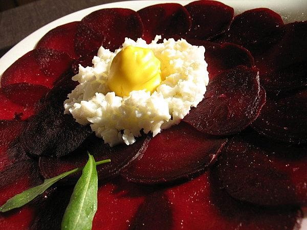Carpaccio de betterave rouge et son nid de poule