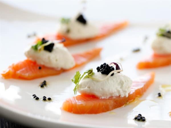 Carpaccio de saumon fumé et quenelle de crème sure au caviar