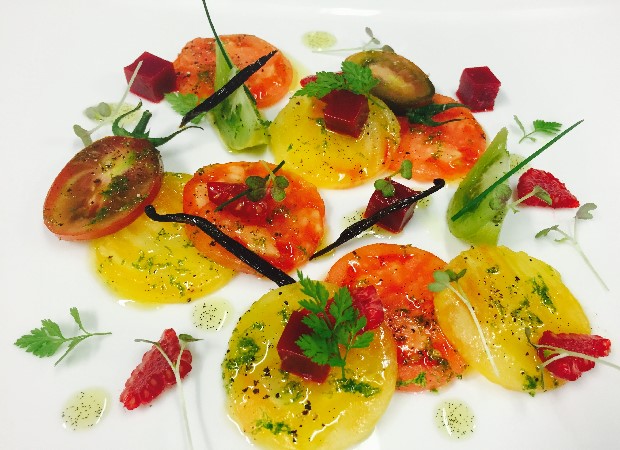 Carpaccio de tomates à la vanille et aux framboises