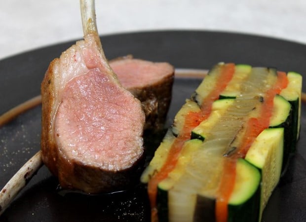 Carré d’agneau de lait rôti et pressé de légumes