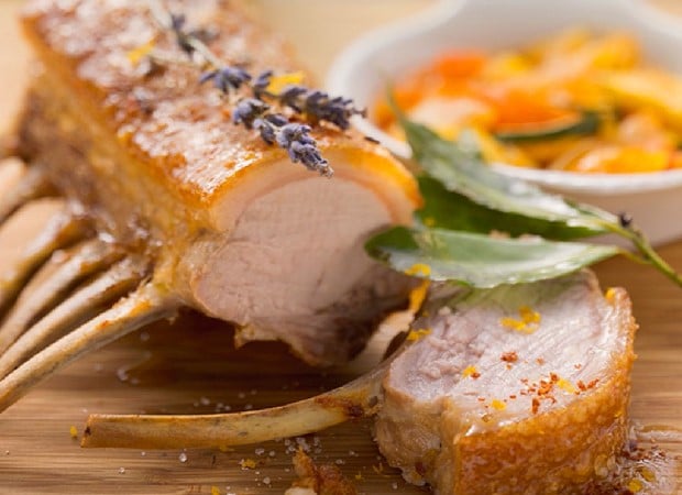 Carré de cochon de lait rôti à la lavande et aux poivrons