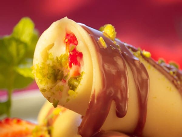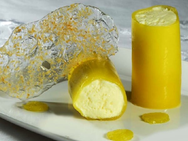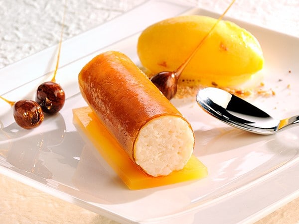 Cannelloni de mangue à l’agar-agar, farci de mousse au chocolat blanc