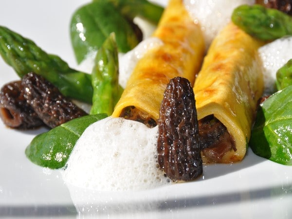 Cannellonis farcis à la viande de bœuf aux asperges vertes et aux morilles