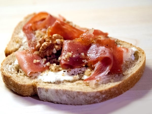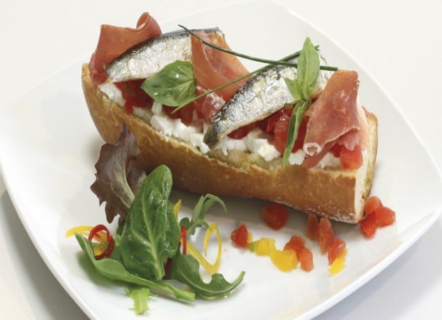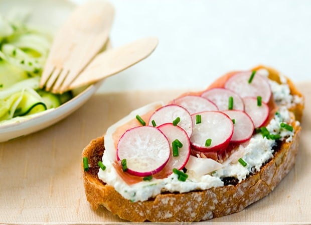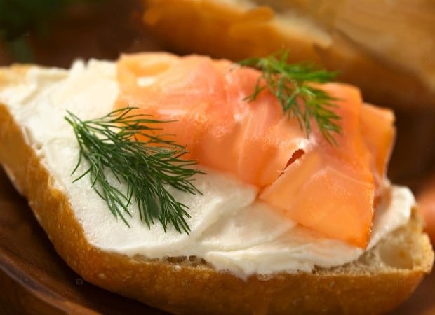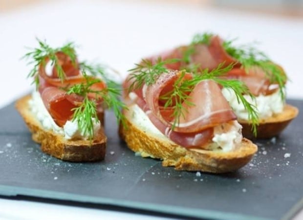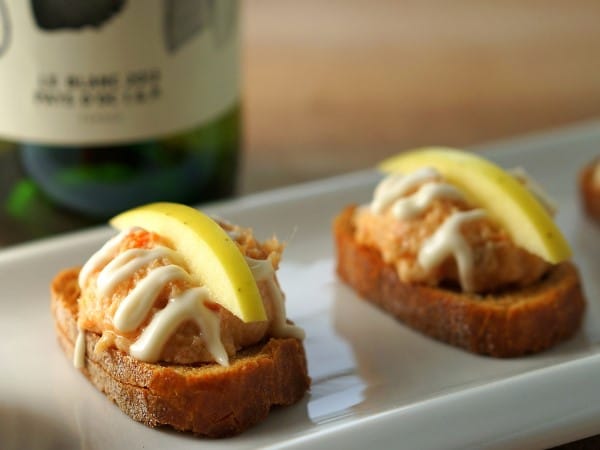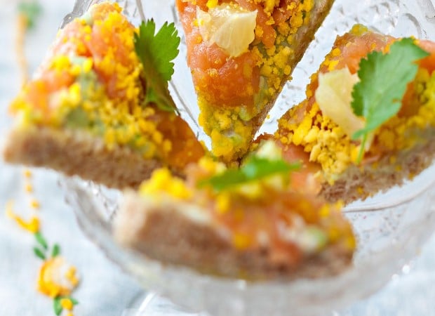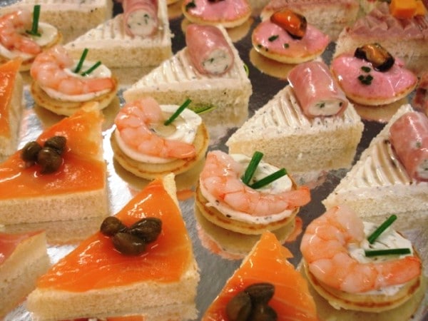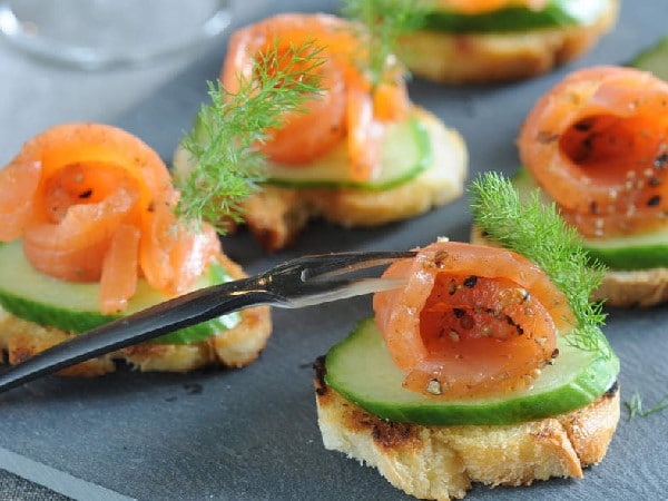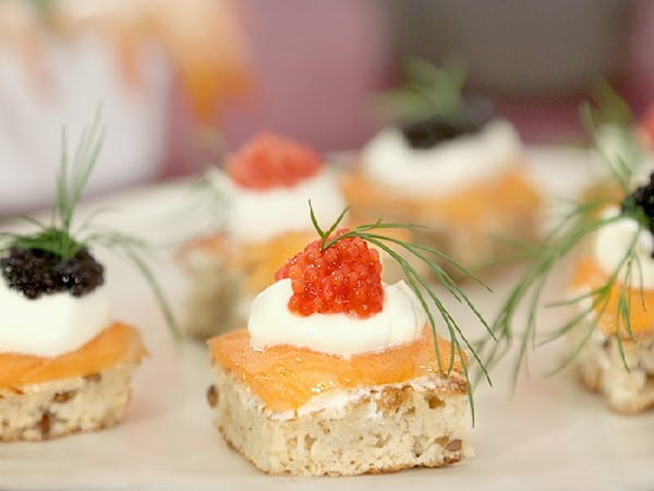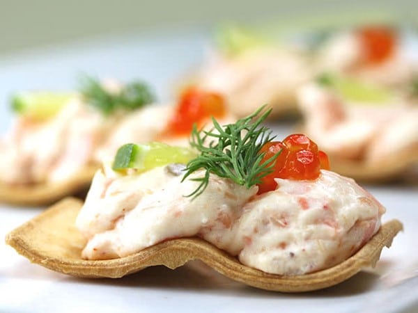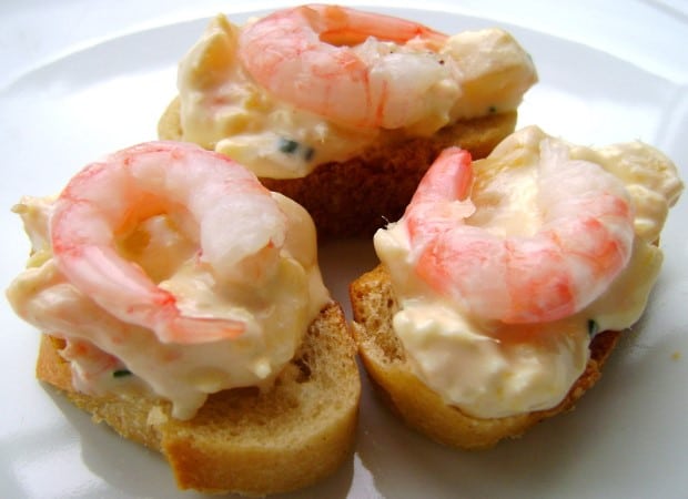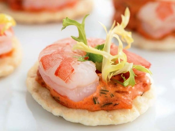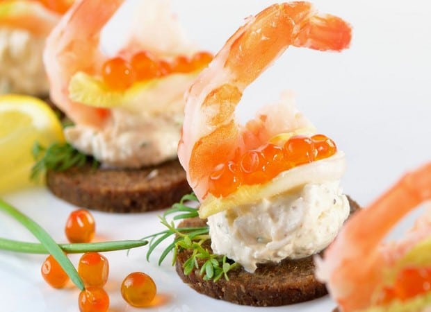 Canapés aux crevettes, crème au raifort et œufs de saumon