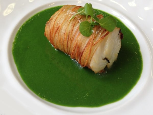 Croustillant de cabillaud en spaghettis de pomme de terre, sauce cresson