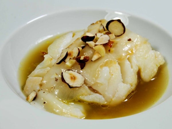 Dos de cabillaud aux noisettes et bouillon de champignons