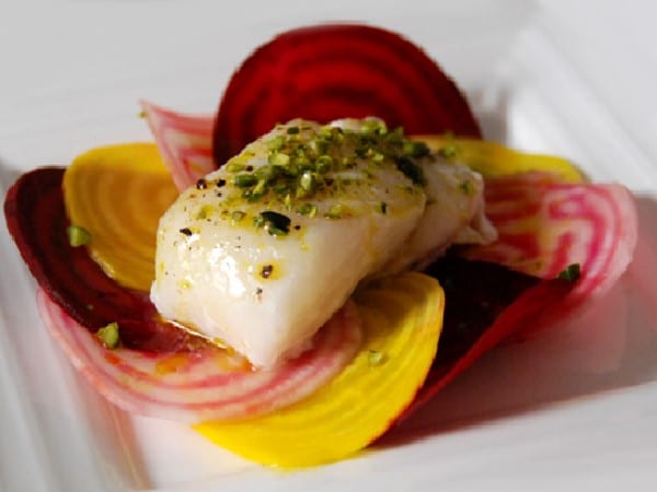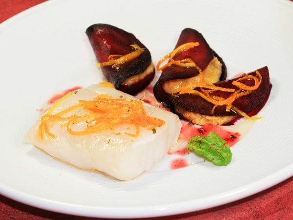 Dos de cabillaud, ravioles de betterave au sabayon d’oignon et zestes d’agrume