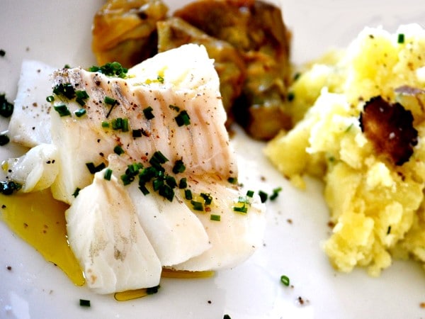 Dos de cabillaud rôti, petits artichauts et écrasée de pomme de terre aux truffes