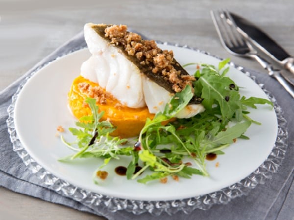 Pavé de cabillaud, purée de potimarron et crumble de foie gras