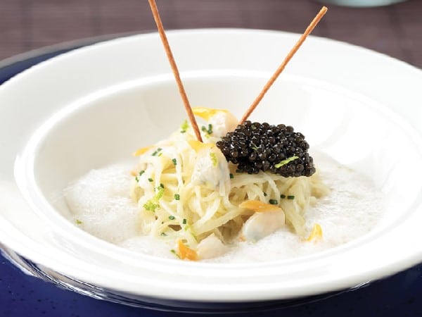 Nage de coque aux spaghettis de pomme de terre et top de caviar