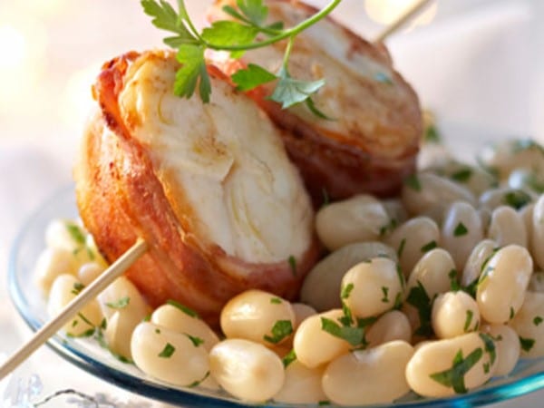 Queue de langouste au lard et haricots blancs
