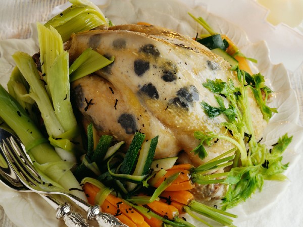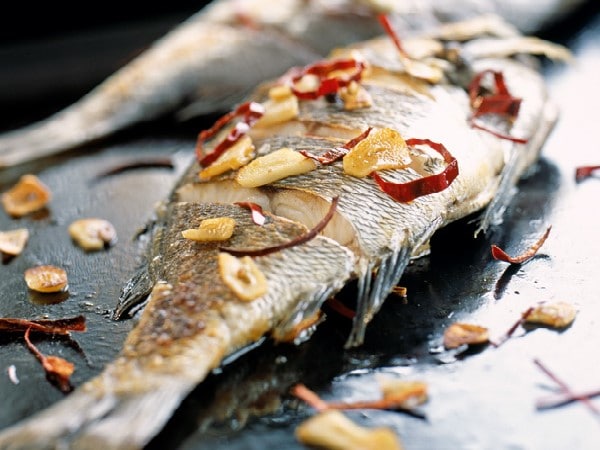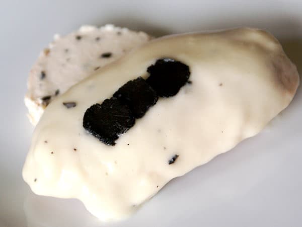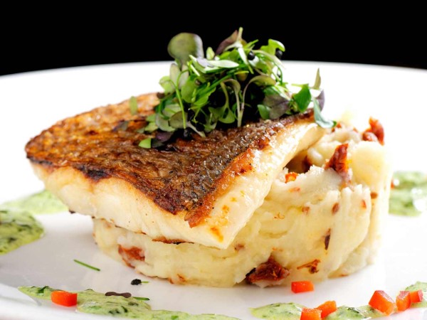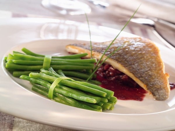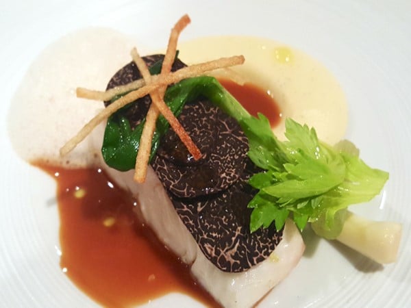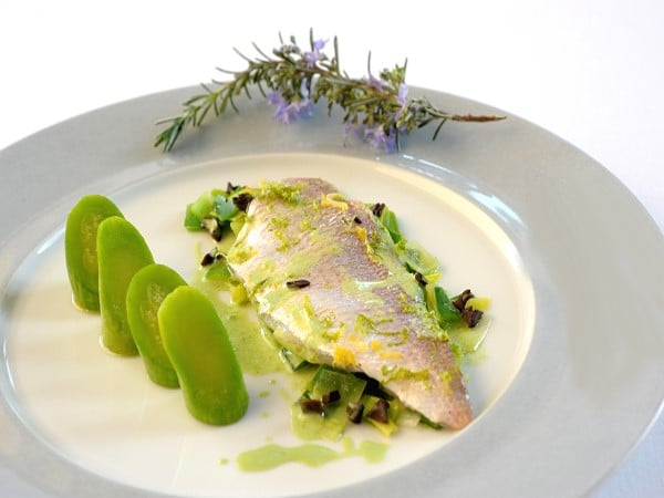 Filet de dorade au four, purée à la vanille et mini poireaux, jus de rôti, lamelles de truffe