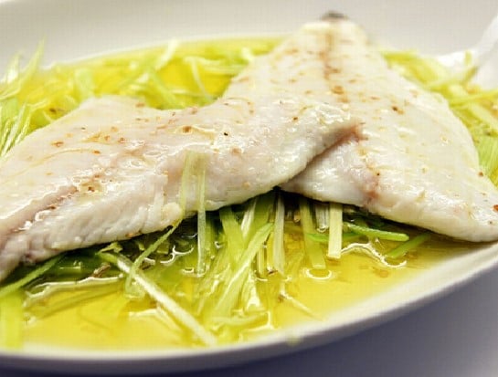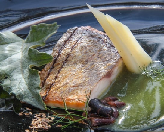Filets de daurade sur un lit de poireaux au fenouil et huile d’olive