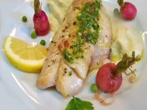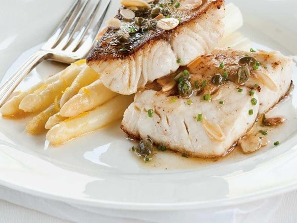 Filet de doré meunière aux câpres et amandes, asperges blanches aux zestes d’agrume