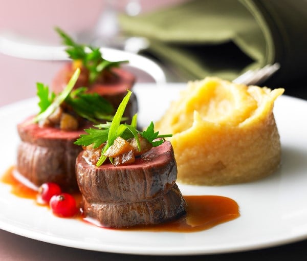 Noisettes de chevreuil sauce bordelaise, mousseline de pomme de terre