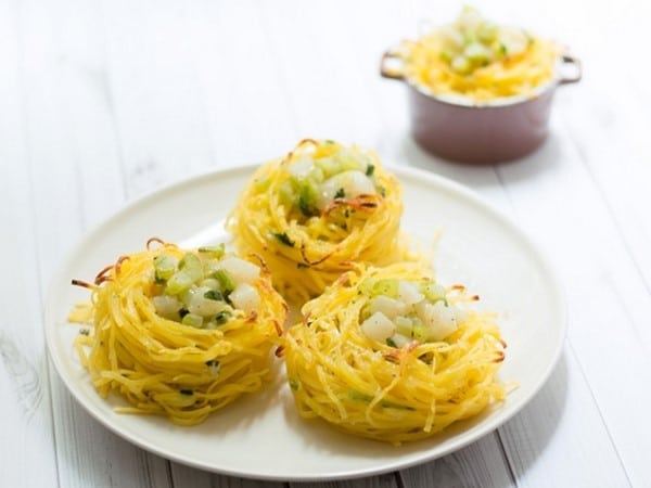 Nids de tagliolini à la crème de gorgonzola et aux poires