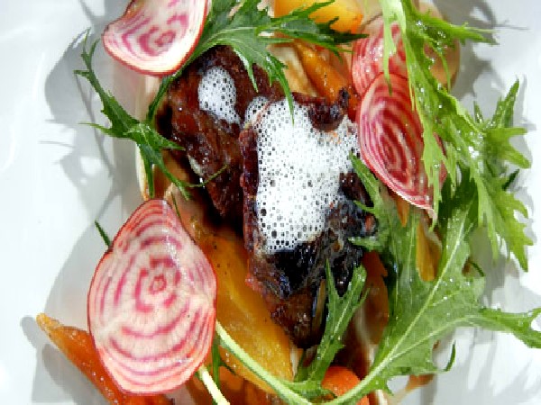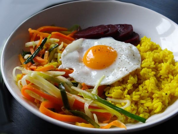Julienne de légumes, œuf au plat, betterave et riz safrané
