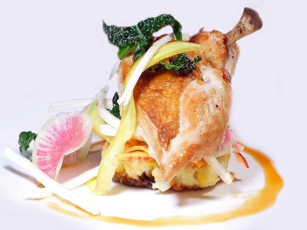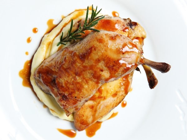 Poulet Jidori laqué au vinaigre balsamique sur mousseline de pomme de terre