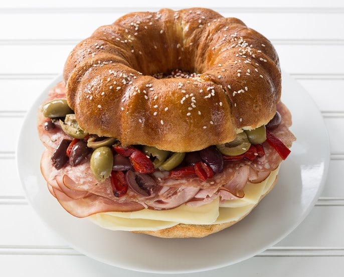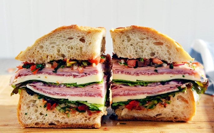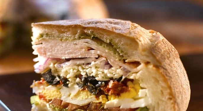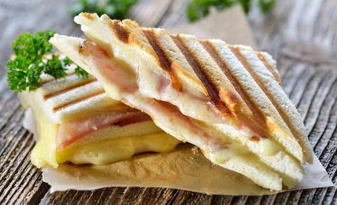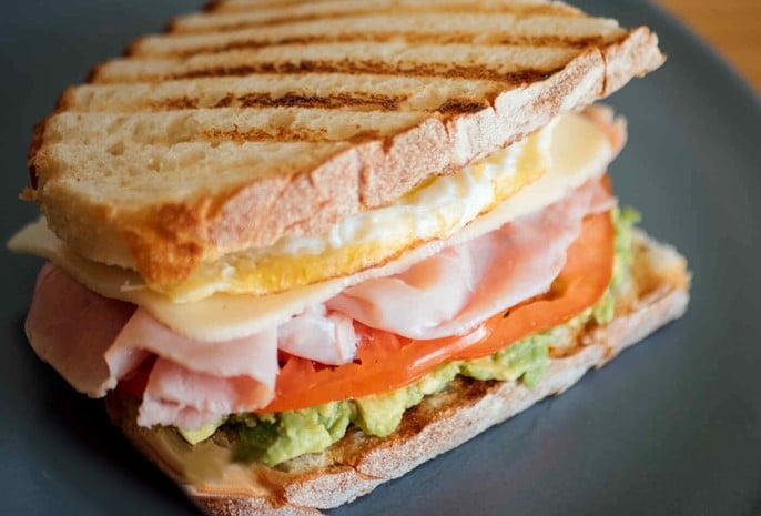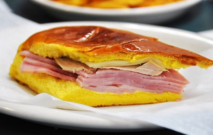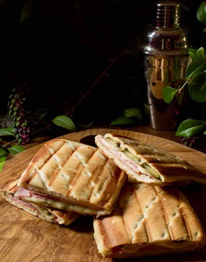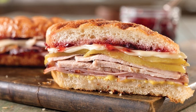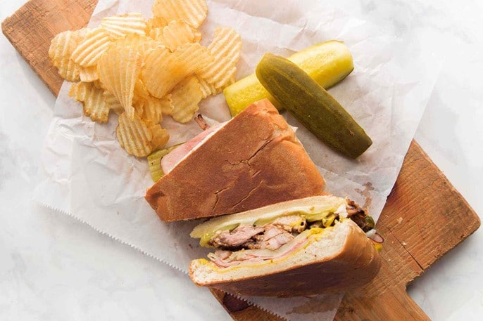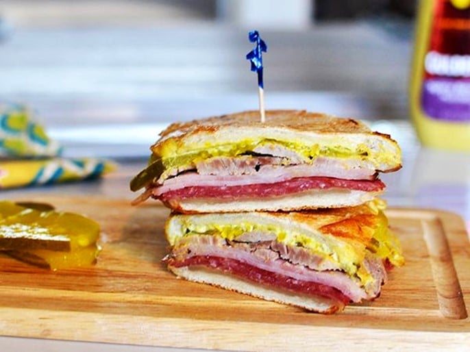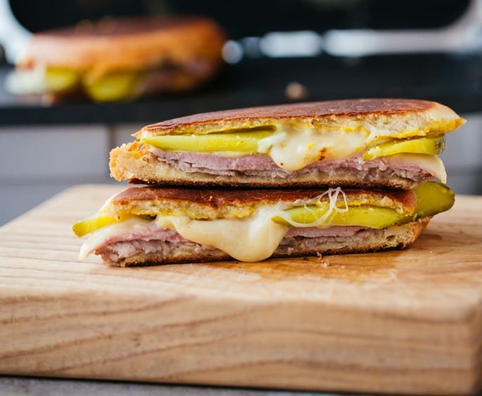 Sandwich medianoche au fromage suisse, jambon cuit et cornichon sucré