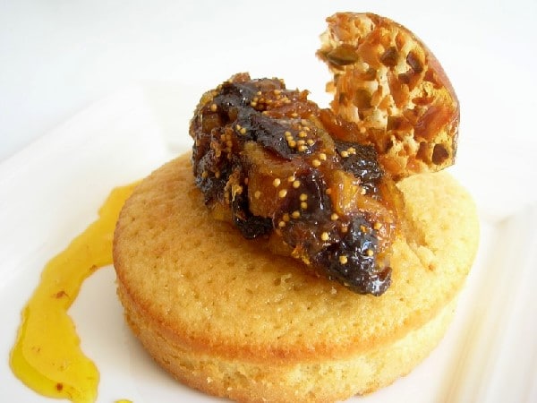 Quenelle de fruits secs sur fondant au citron et nougatine à la pistache