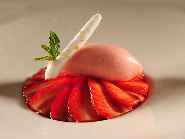 Quenelle de sorbet fraise sur nage de fraises, stick au citron