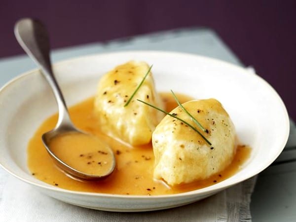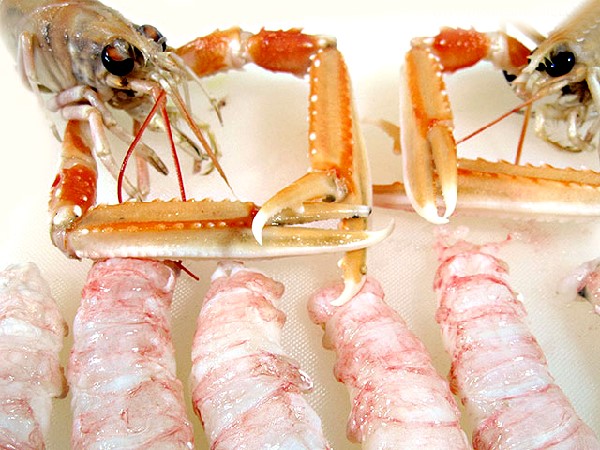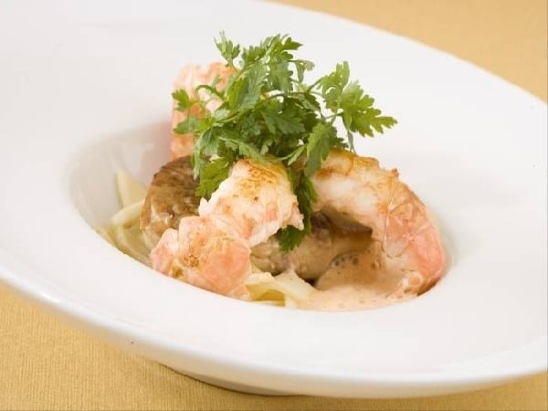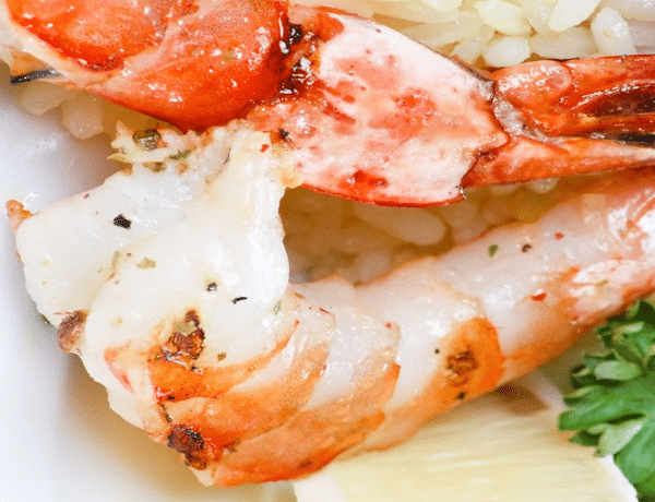 Queues de langoustines en brochette de citronnelle, foie gras et céleri poêlés, jus de crustacés