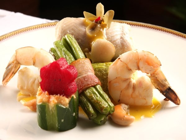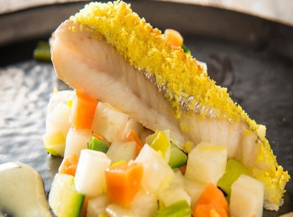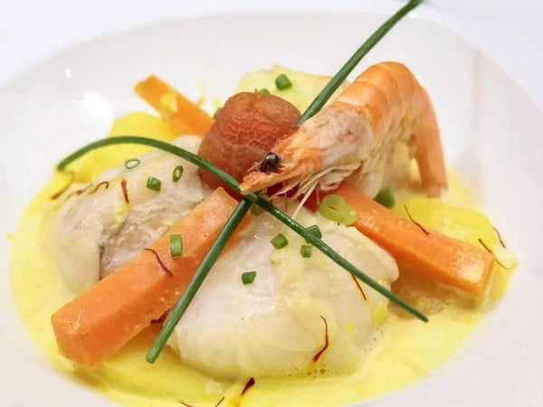 Filet de truite, marinière de crustacés et bouquetière de légumes
