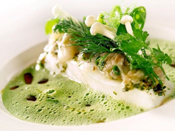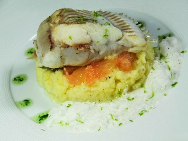 Barbue, écrasée de pommes de terre à la vanille, coco et huile de coriandre
