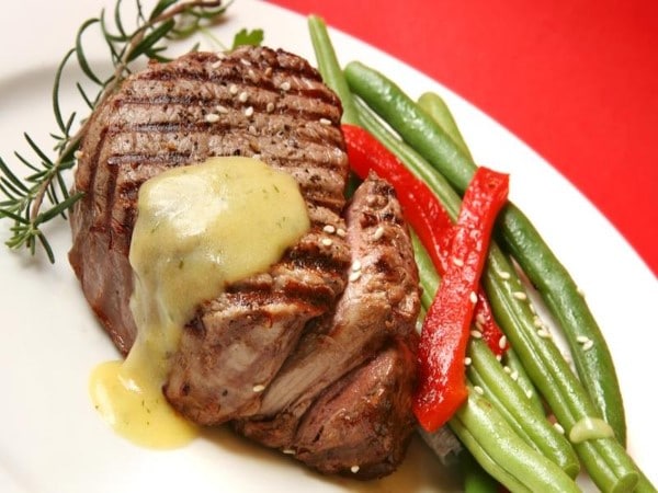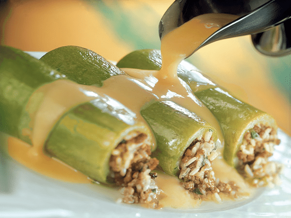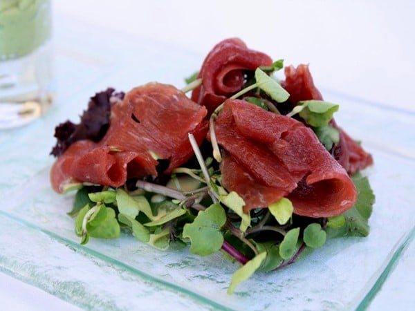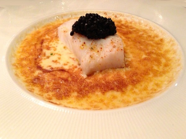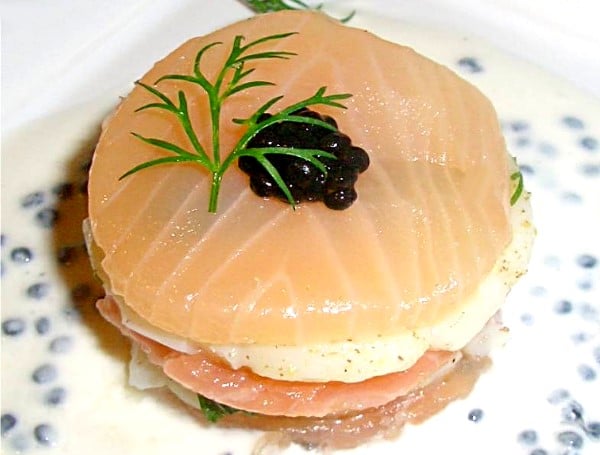 Millefeuille de saumon et Saint-Jacques en crème d’Avruga