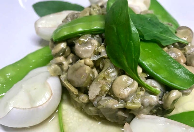 Faves ofegades aux oignons blancs et aux pois mange-tout