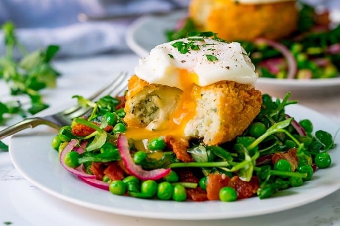 Gâteau de poisson à l’œuf mollet et aux légumes printaniers