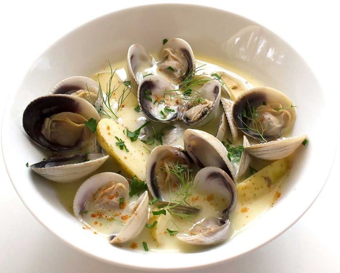 Palourdes cuites à la vapeur à la crème d’ail et pommes de terre