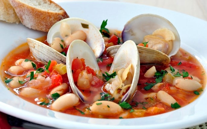 Palourdes cuites à la vapeur aux haricots blancs et bouillon à la tomate