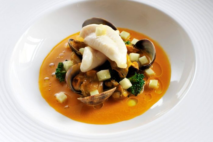 Palourdes cuites à la vapeur et au saké, cabillaud et brocolis