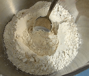 Fontaine (en) : locut. Mettre « en fontaine », c’est faire un tas de farine disposé sur un marbre, une planche ou un récipient et au milieu duquel on a pratiqué un trou rond ou un « puits » pour y verser les ingrédients nécessaires à la fabrication d’une pâte. Tous les éléments seront alors incorporés progressivement en les rabattant du bout des doigts vers le centre.