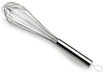 – Le fouet à blancs ou fouet à ballon : Court et arrondi, avec des fils souples, fixés par une virole dans un manche en bois, il sert à monter les blancs d’œuf en neige. Il s’emploie aussi pour la purée de pomme de terre, pour battre les jaunes d’œuf avec du sucre (notamment pour le sabayon) et pour fouetter la crème fraîche.