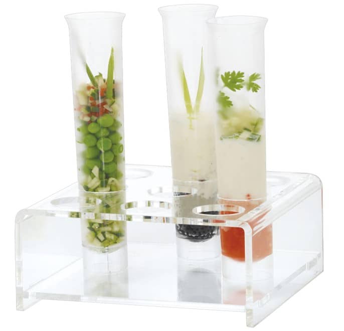 Muni ou non d’un petit bouchon, le tube à essai a fait son apparition il y a plusieurs années sur les tables des restaurants et sert à contenir des sauces, jus, fonds et autres liquides pour accompagner le plat de base, évitant ainsi un mélange prématuré avant la dégustation.